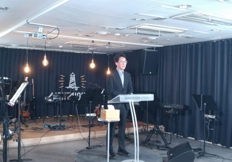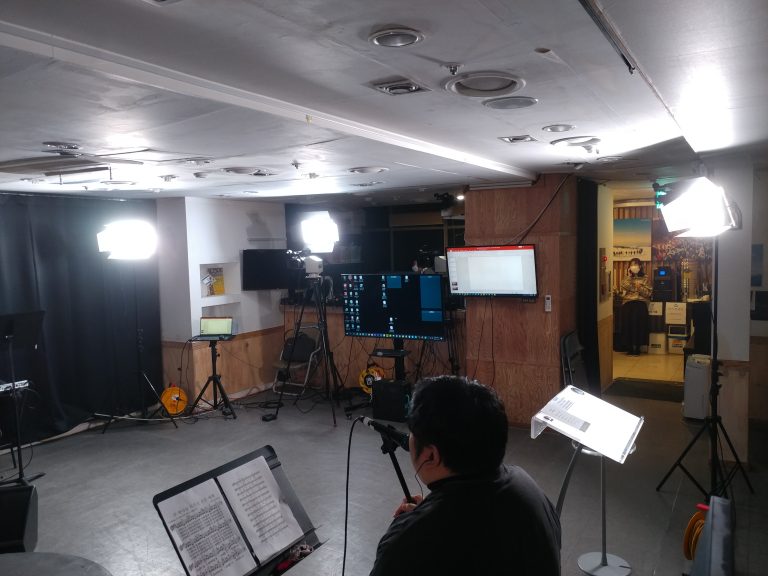 이 자리에 성도님들이 모여 계시면 좋겠지만 코로나19로 인해 이 날 예배 역시 비대면 온라인예배로 드려져, 모니터와 각종 방송장비들이 자리를 대신하고 있습니다.