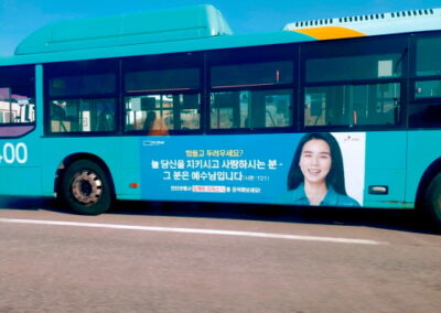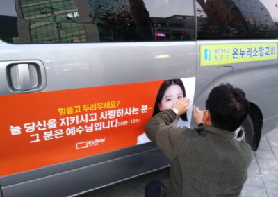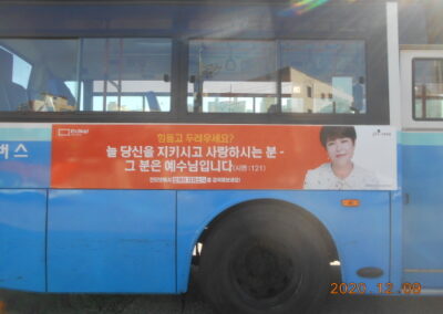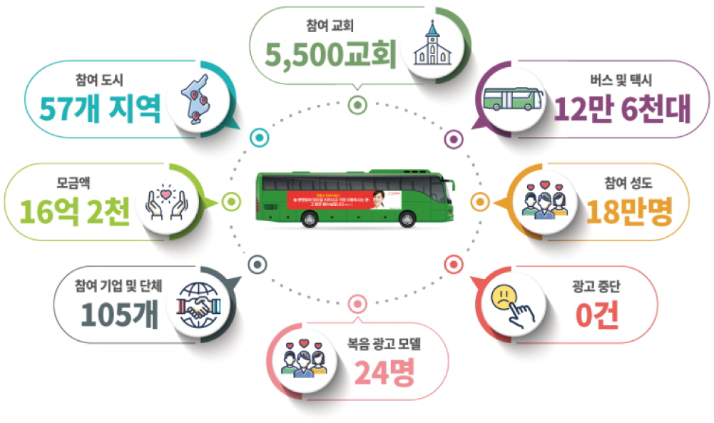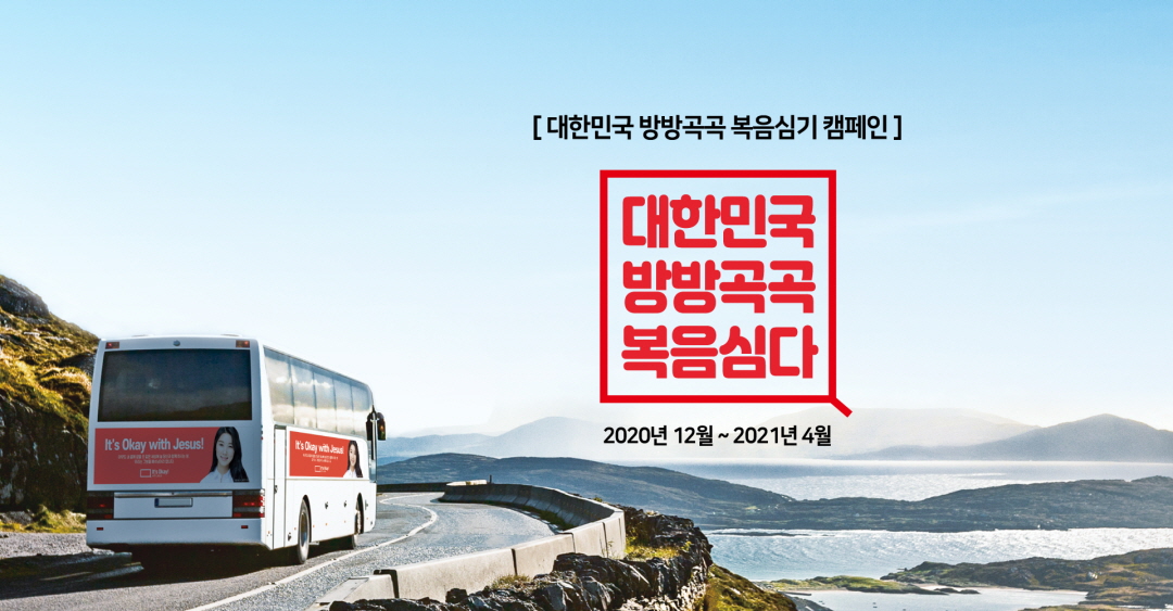 캠페인 열방에 복음을 자랑하다 2020 방방곡곡 복음심기2020방방곡곡, 국내캠페인, 캠페인 비대면 시대에도 복음은 멈추지 않았습니다.비대면 전도의 가장 효과적인 대안으로서일상 속 복음광고를 통한 복음의 비대면 접촉을 극대화하는복음광고 캠페인입니다. 다니엘 기도회 다니엘 기도회를 통하여대한민국 방방곡곡이기도로 함께합니다. 복음광고 전국 2,000대의버스와 택시에복음광고가 실립니다. 온라인 양육 온라인 선교사이트에서비기독교인들이복음으로 양육됩니다. 5,500교회와 18만 동역자님의 도움으로12만 6천대의 버스와 택시가대한민국 57개 도시에 복음을 싣고 달렸습니다. 복음광고 모델 1 of 2 갤러리 캠페인 결과보고