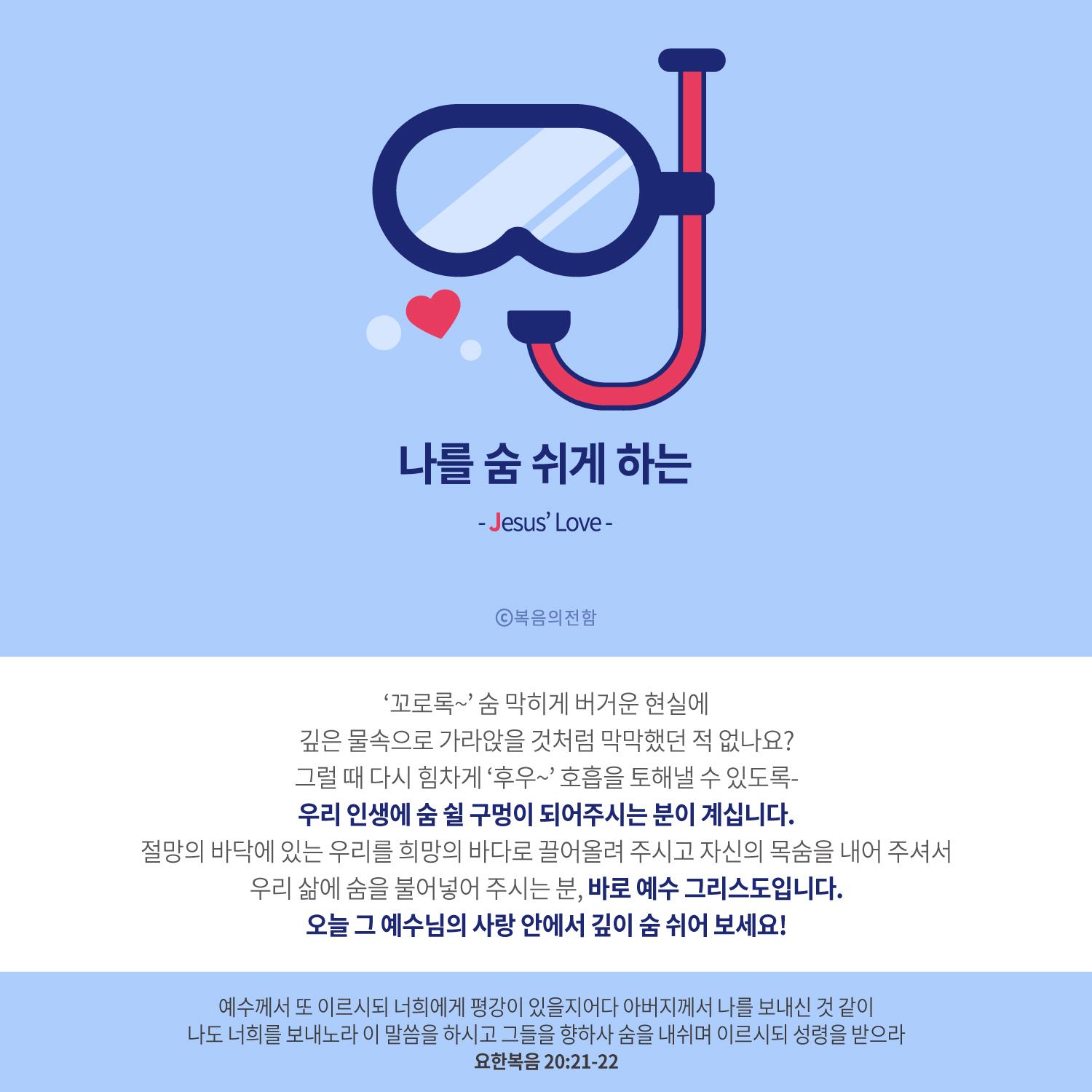 이 말씀을 하시고 그들을 향하사 숨을 내쉬며 이르시되 성령을 받으라 <요한복음 20:21-22>