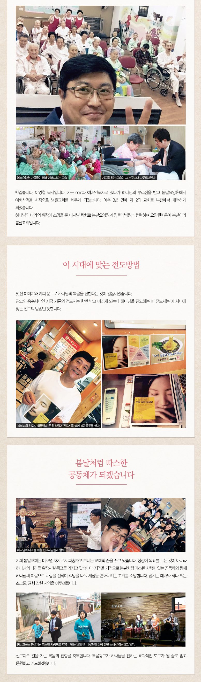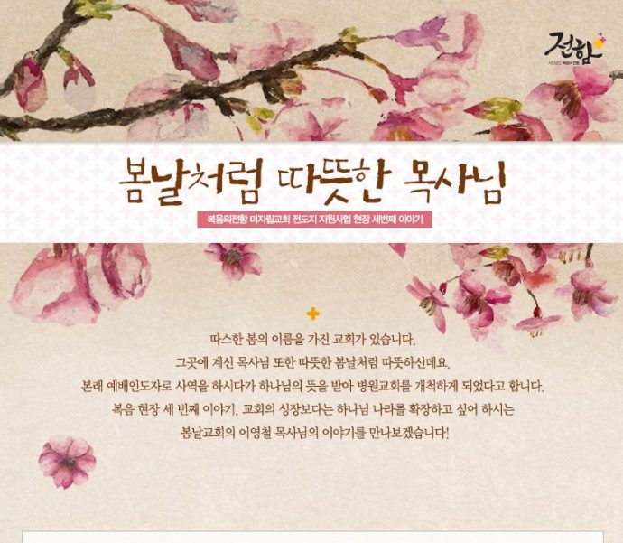 봄날처럼 따뜻한 목사님 – 봄날교회 이영철 목사님 1월 6, 2016 따스한 봄의 이름을 가진 교회가 있습니다. 그곳에 계신 목사님 또한 봄날처럼 따뜻하신데요. 교회의 성장보다는 하나님의 나라를 확장하고 싶어하시는 봄날교회의 이영철 목사님의 이야기를 만나보겠습니다!