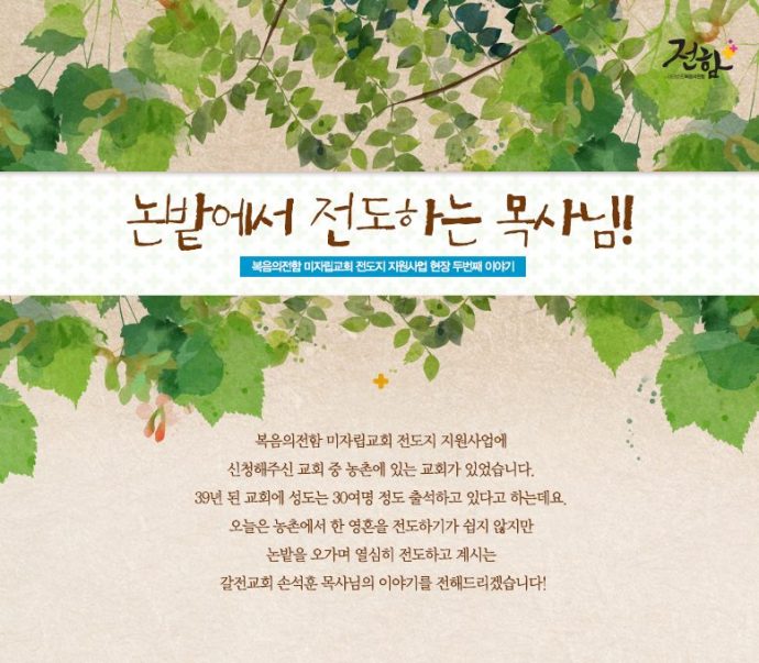 신청해주신 교회 중 농촌에 있는 교회가 있었는데요. 농촌에서 한 영혼을 전도하기가 쉽지는 않지만 열심히 논밭에서 전도하시는 갈전교회의 손석훈 목사님의 이야기 입니다.