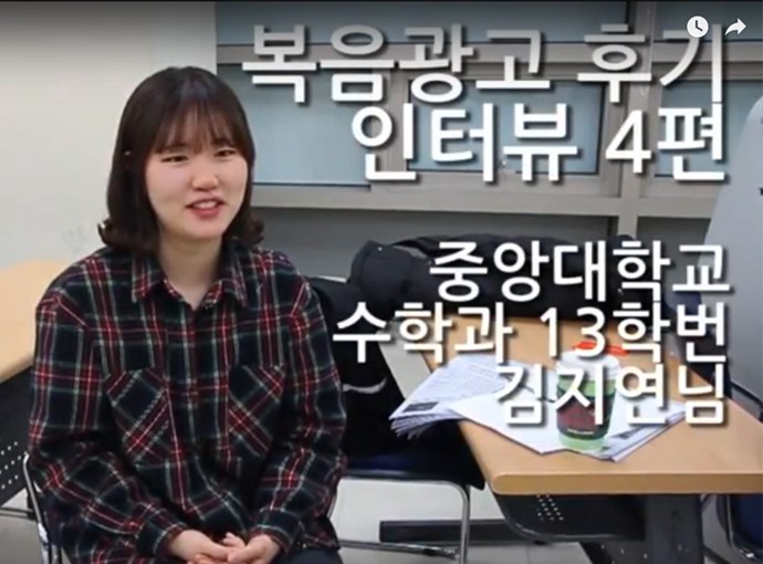중앙대학교 수학과 13학번 김지연 님 1월 20, 2015 복음광고 후기 인터뷰 4편 – 중앙대 수학과 13학번 김지연님입니다! 복음의전함을 SNS를 통해 알게된 이후로 응원해주고 계신데요. CCC 에서 활동하며 복음 전파에 힘쓰고 있는 청년입니다. 하나님 안에서 귀한 쓰임 받기를 기대하고 기도합니다^^