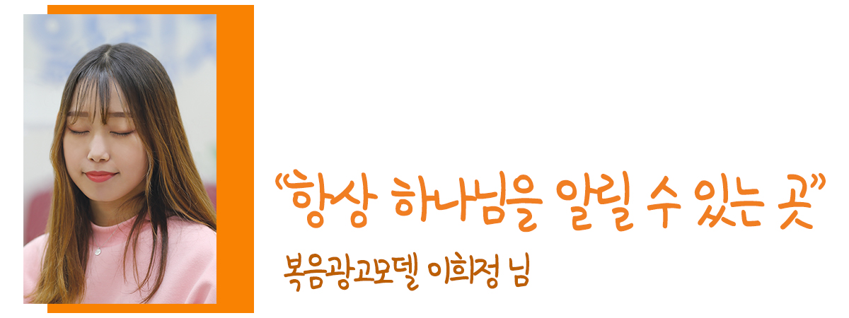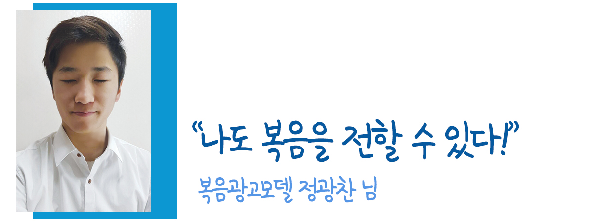 교회 청년이 신문을 보여주며 광고를 통해서 복음을 전할 수 있는 곳이 있다고 해서 복음광고 모델에 참여하게 되었습니다. 부족한 한 사람이 복음을 전하는 일에 참여할 수 있어서 너무 감사합니다. 복음을 전하기 힘든 세대에 광고를 통해 복음을 전하는 멋진 하나님 나라의 동역자분들을 통해서 하나님의 나라 확장될 것을 믿습니다. 뒤에서 기도하고 응원하겠습니다.