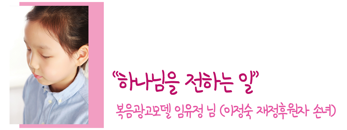 할머니께서 제가 기도하는 사진을 찍어서 보내주셨습니다. 복음광고 모델이 된다는 것에 기분이 좋았고 하나님을 전하는 일에 참여할 수 있어 좋았습니다. 복음의전함이 세계적으로 더 큰 복음을 전하길 바랍니다.