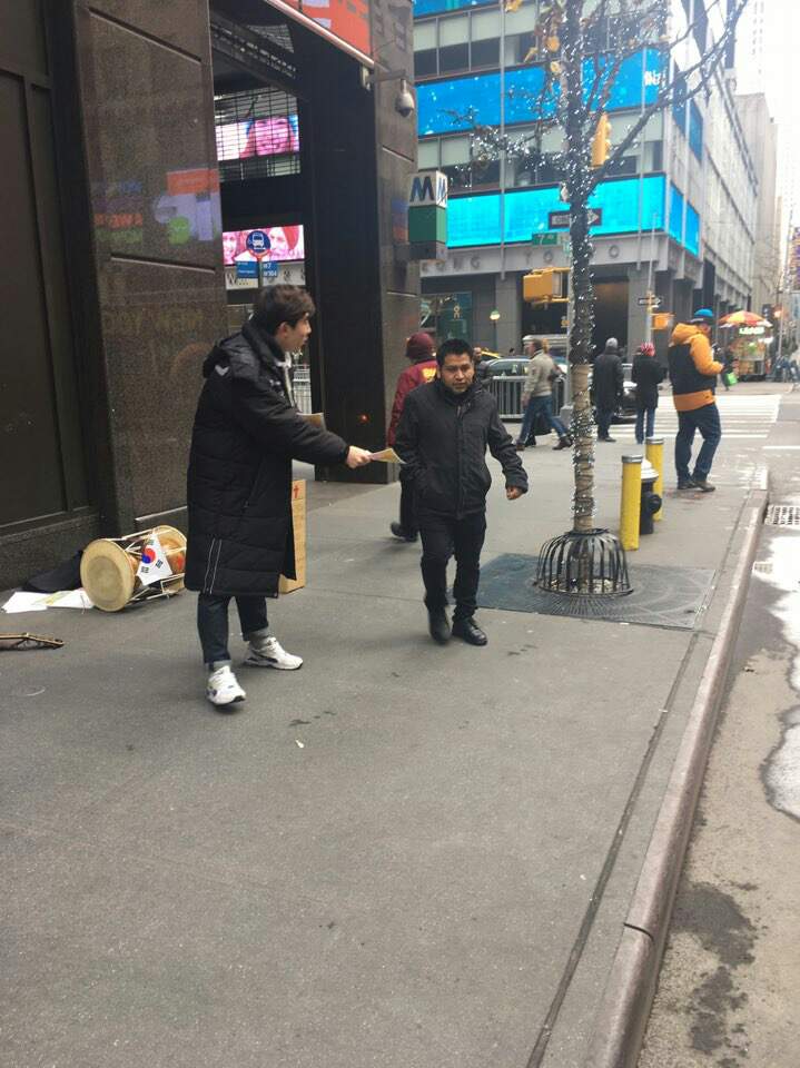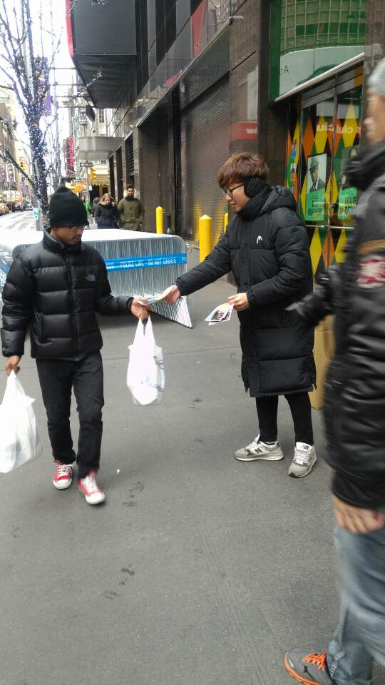 A: 복음의전함이 걸었던 복음광고 전광판 밑에서 전도를 했어요. 광고판이 꽤 크더라고요. 그게 정말 든든했어요. 뭉클하기도 했구요. 사물놀이도 하고, 친구가 기타를 치고 찬양하면 저는 전도지를 나눠줬어요. 저희는 영어가 안되니까 ‘해피 뉴이어’라고 이야기하면서 전도지를 줬거든요. 짧은 영어지만 ‘이 전도지 안에 복음이 들어있다. 그러니까 이걸 믿고 전달하자’라는 마음이었어요. 안 받는 사람들도 있었지만 받아주시는 분들이 전도지를 읽는 모습을 보면 뿌듯하더라고요.