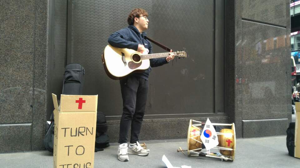 A: 그건 아니었어요. 뉴욕으로 배낭여행 가겠다는 계획을 세우고 있었는데 그냥 남들처럼 유명 관광지를 가는 것보다 특별한 여행을 하고 싶다라는 생각을 하고 있었거든요. 그때 하나님께서 ‘거리에서 전도를 해라’라는 마음을 주셨어요. 그 말씀을 듣고 ‘내가 거기서 거리저도를 하면 하나님이 기뻐하시겠다.’ 라고 생각했어요.