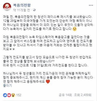 뉴욕으로 여행을 가는데, 복음의전함의 전도지를 가져가서 거리전도를 하고 싶다는 내용이었습니다.