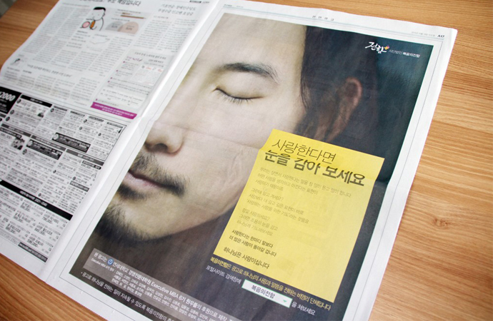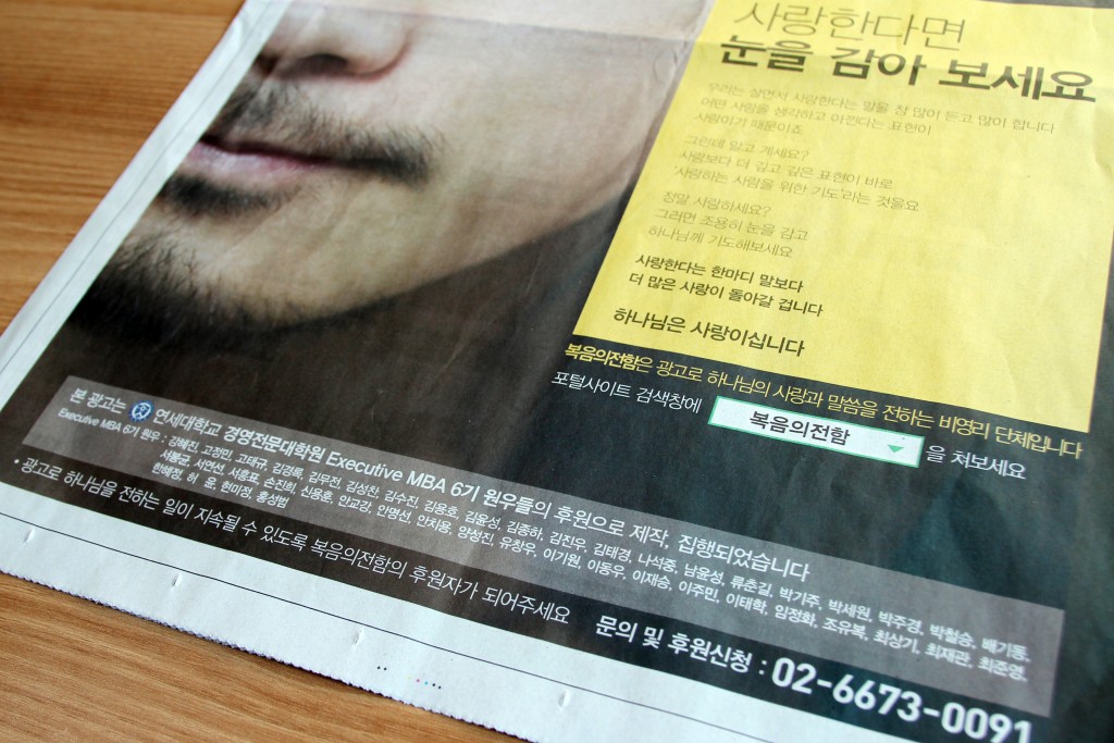 오늘만큼은 믿지 않는 부모님에게, 친구에게, 그리고 동료에게 신문에 실린 복음광고를 보여주세요. 그들이 자연스레 하나님을 알게 될지도 모르니까요.