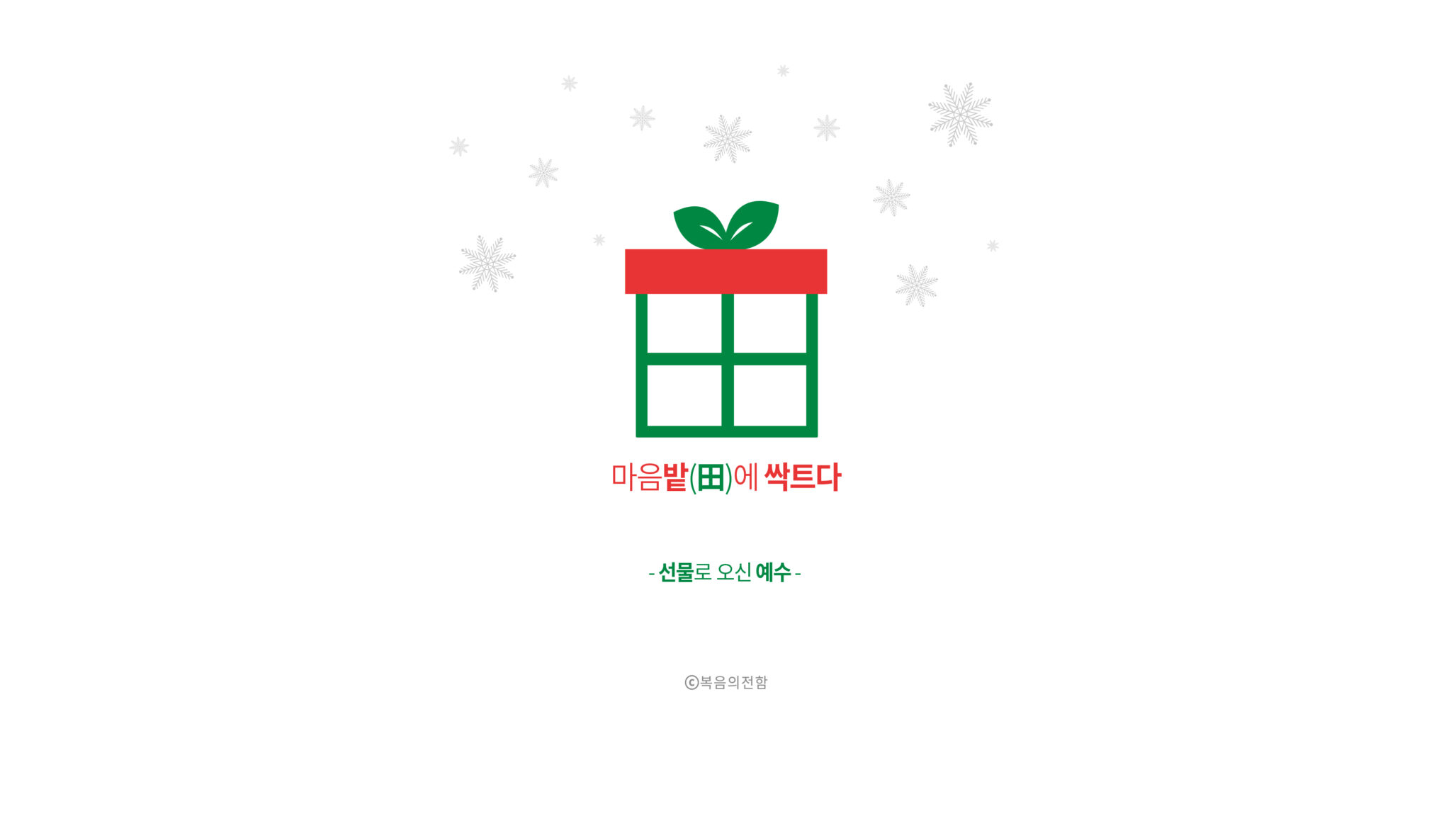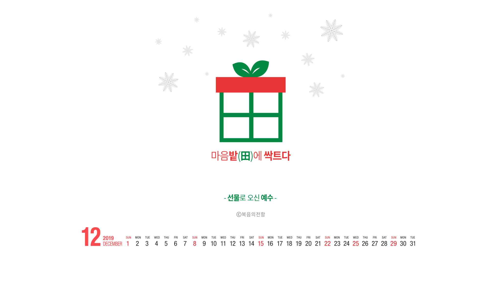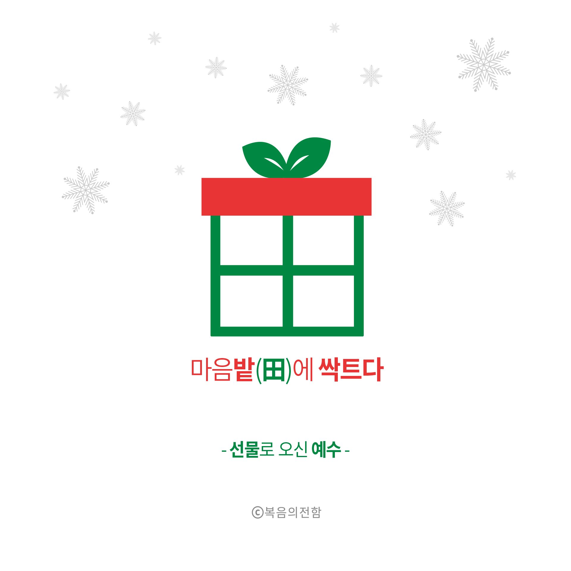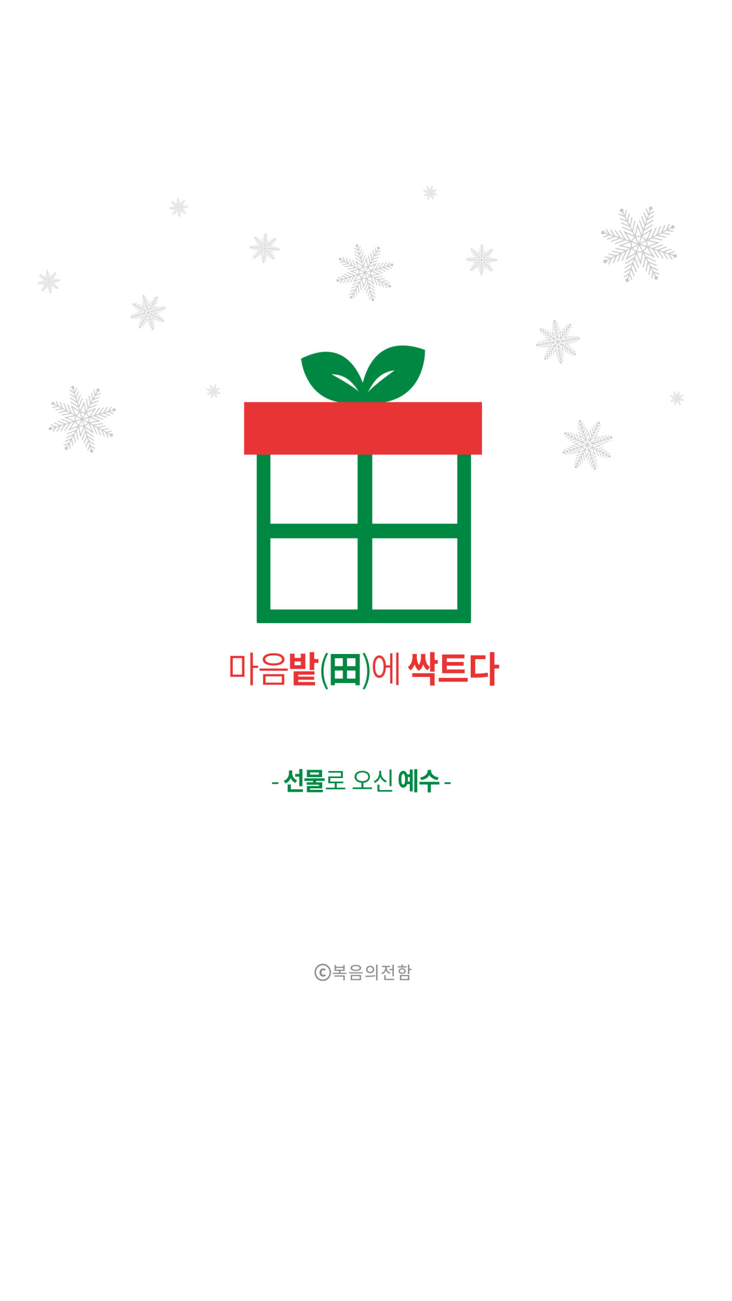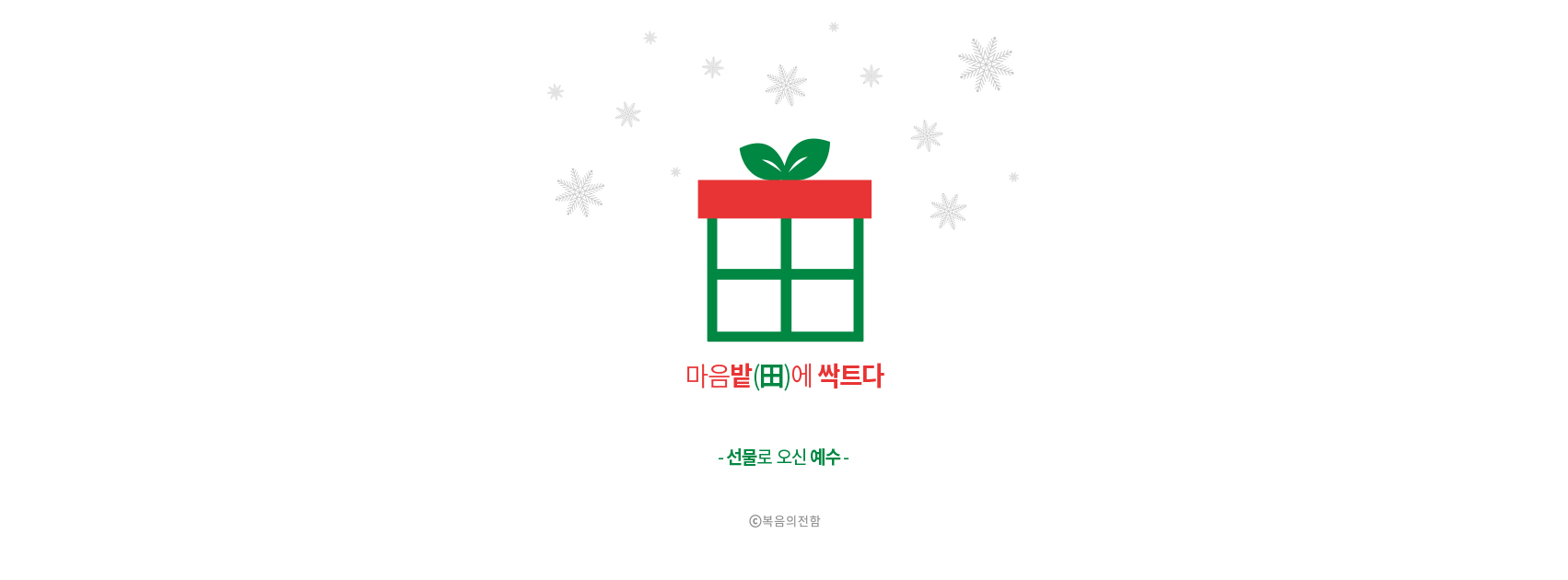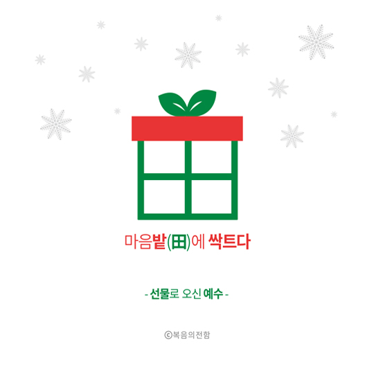성탄절이 있는 12월 ‘심플(心+)’ 테마는 ‘선물로 오신 예수’입니다. 리본끈으로 포장된 선물상자가 한자의 밭전자(田) 모양을 연상시킨다는 점, 상자를 묶은 리본 형태는 마치 새싹을 떠올리게 한다는 점을 조합해 우리의 마음밭에 복음이 심어지는 것이 세상의 그 어떤 것보다 귀하고 값진 선물이라는 의미를 담았습니다.
