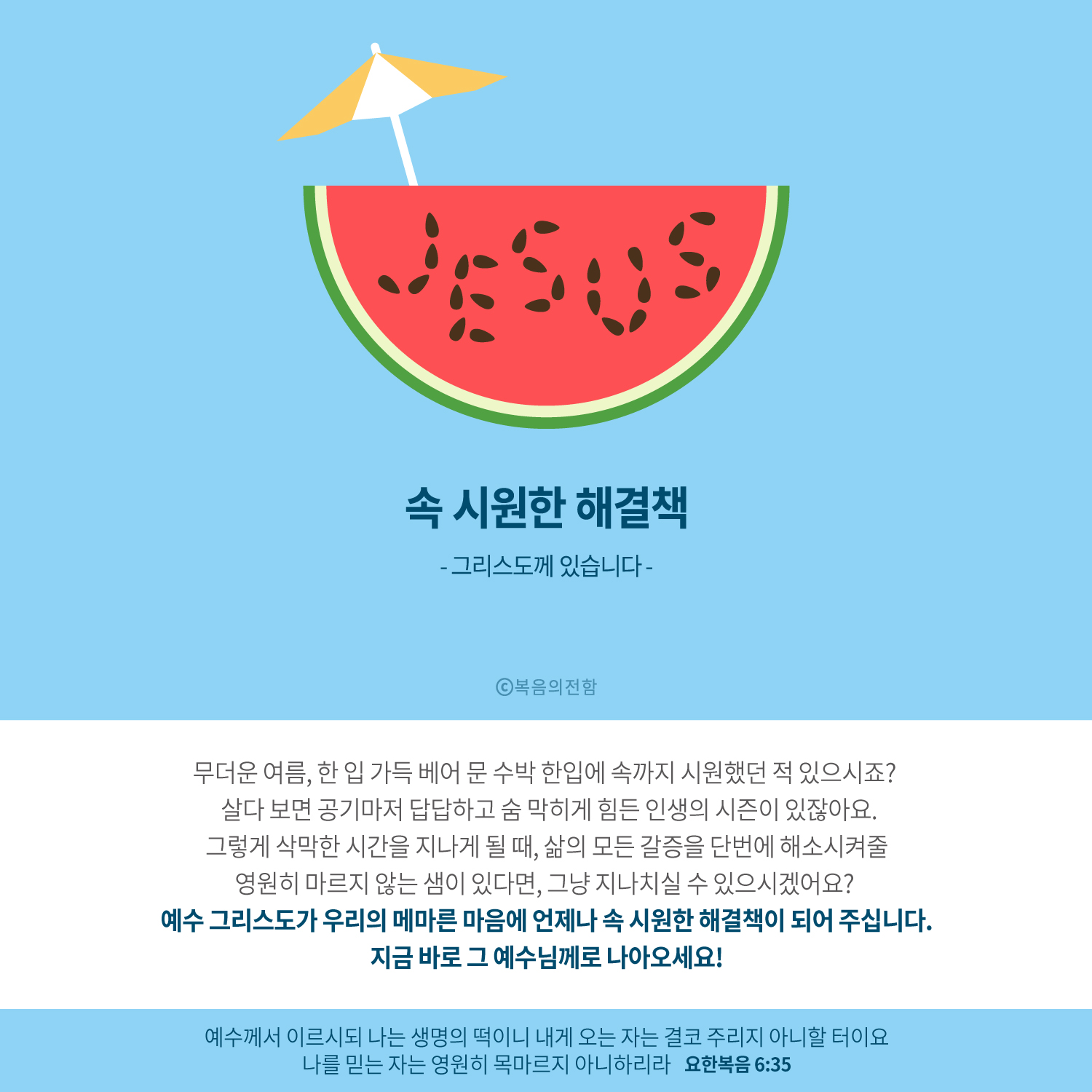 예수께서 이르시되 나는 생명의 떡이니 내게 오는 자는 결코 주리지 아니할 터이요 나를 믿는 자는 영원히 목마르지 아니하리라 (요한복음 6:35)