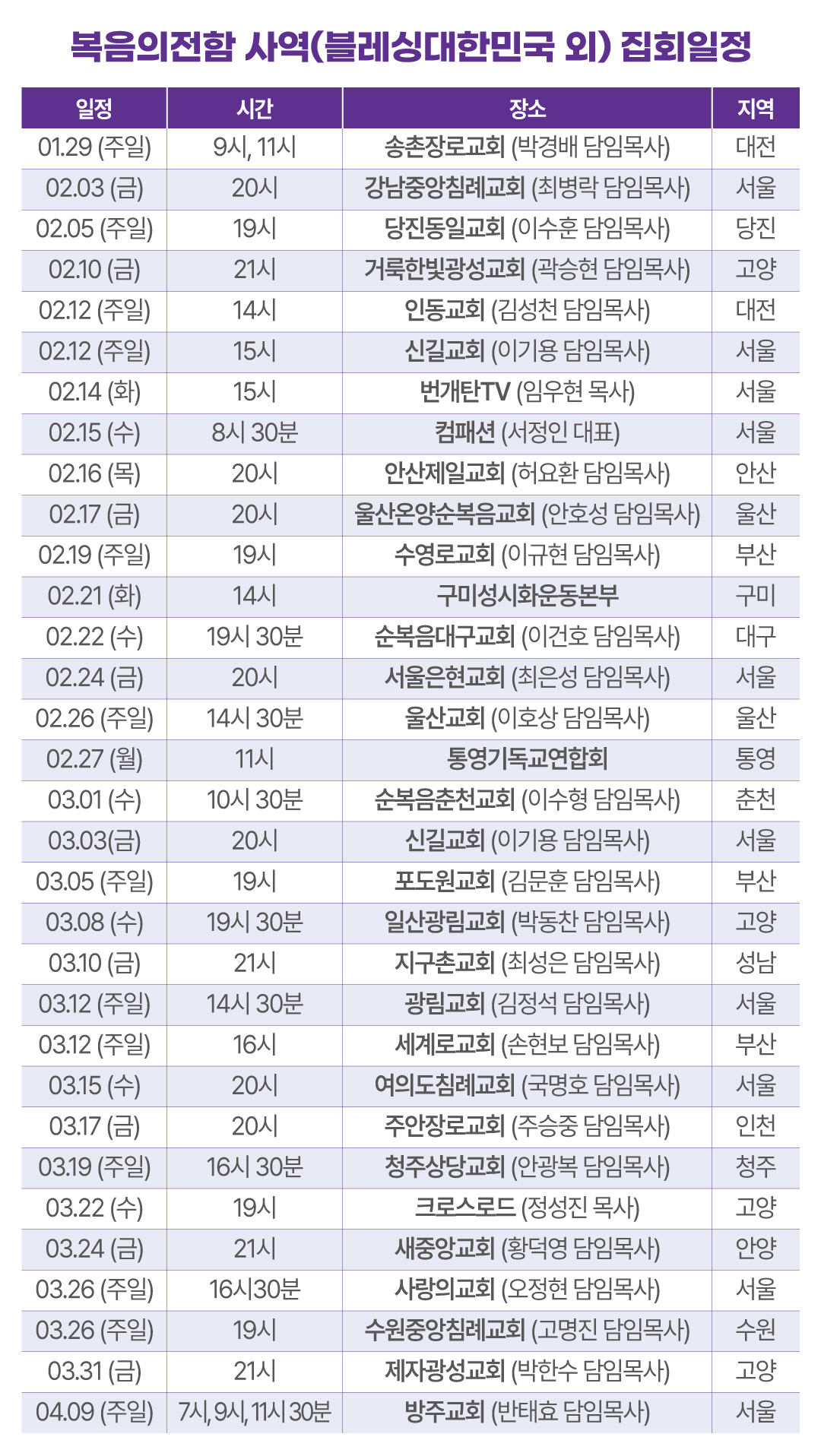 복음의전함 사역 간증 집회 일정(2023년 1~3월)